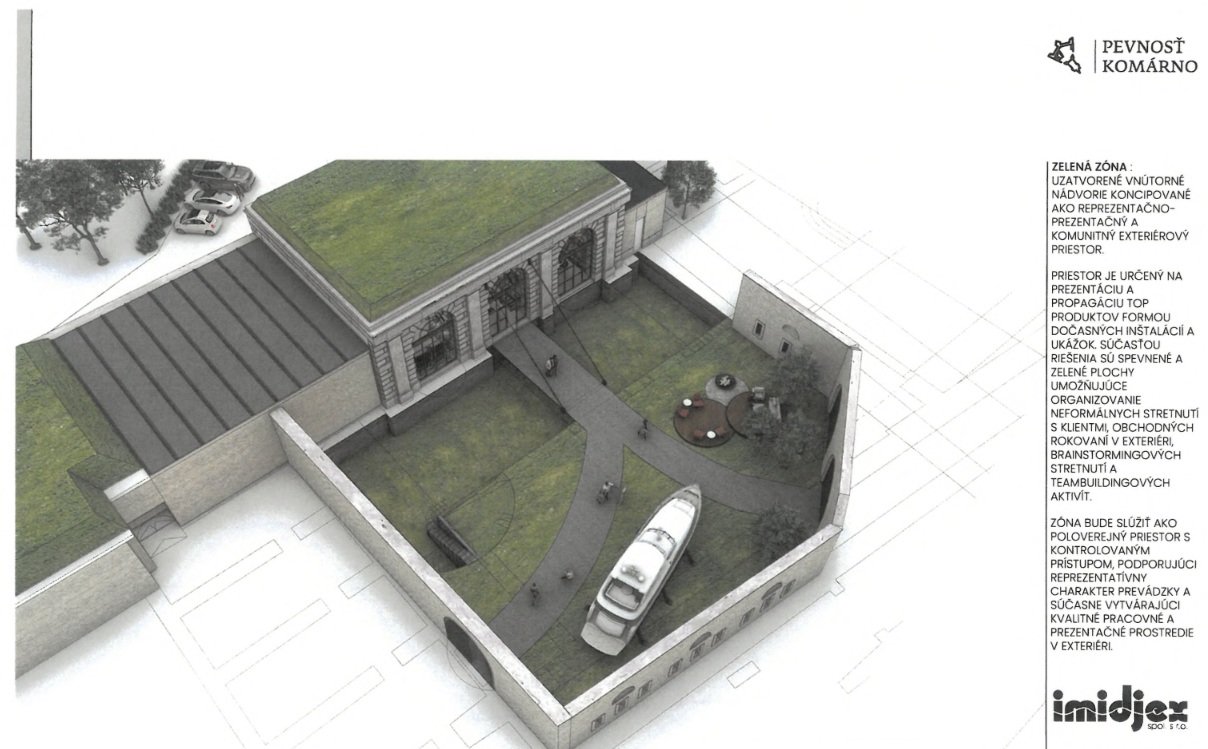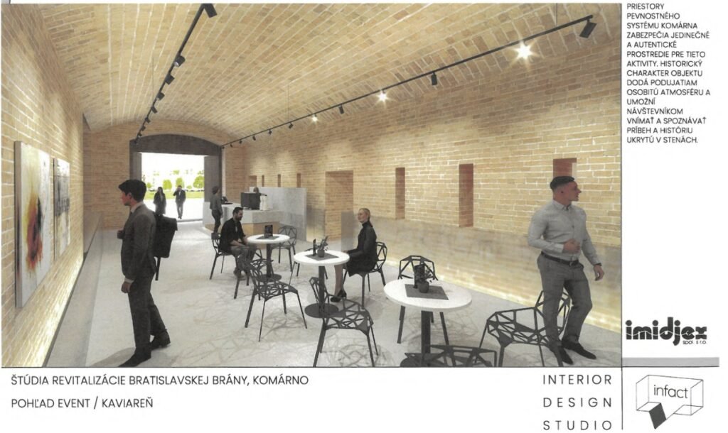Ďalšia časť objektu bude vyhradená pre kaviareň s barom a eventovú zónu, ktorá je navrhnutá pre spoločenské posedenia, školenia či prezentácie. Súčasťou zámeru je aj vytvorenie umeleckej galérie na prezentáciu diel mladých tvorcov, organizovanie menších koncertov a degustácií vín. Komplexný zážitok doplní uzavreté vnútorné nádvorie premenené na „zelenú zónu“ – exteriérový priestor ideálny na dočasné inštalácie, neformálne rokovania a teambuildingy.