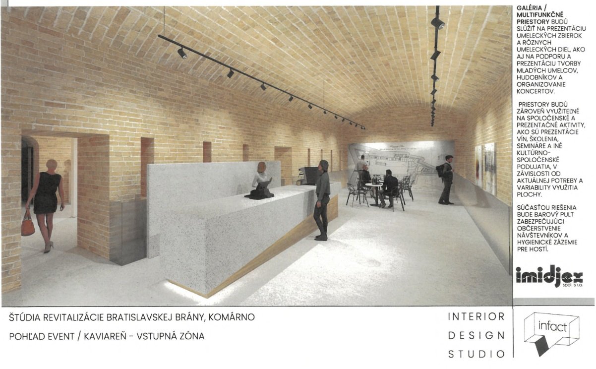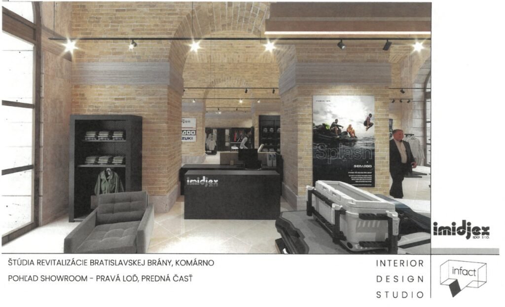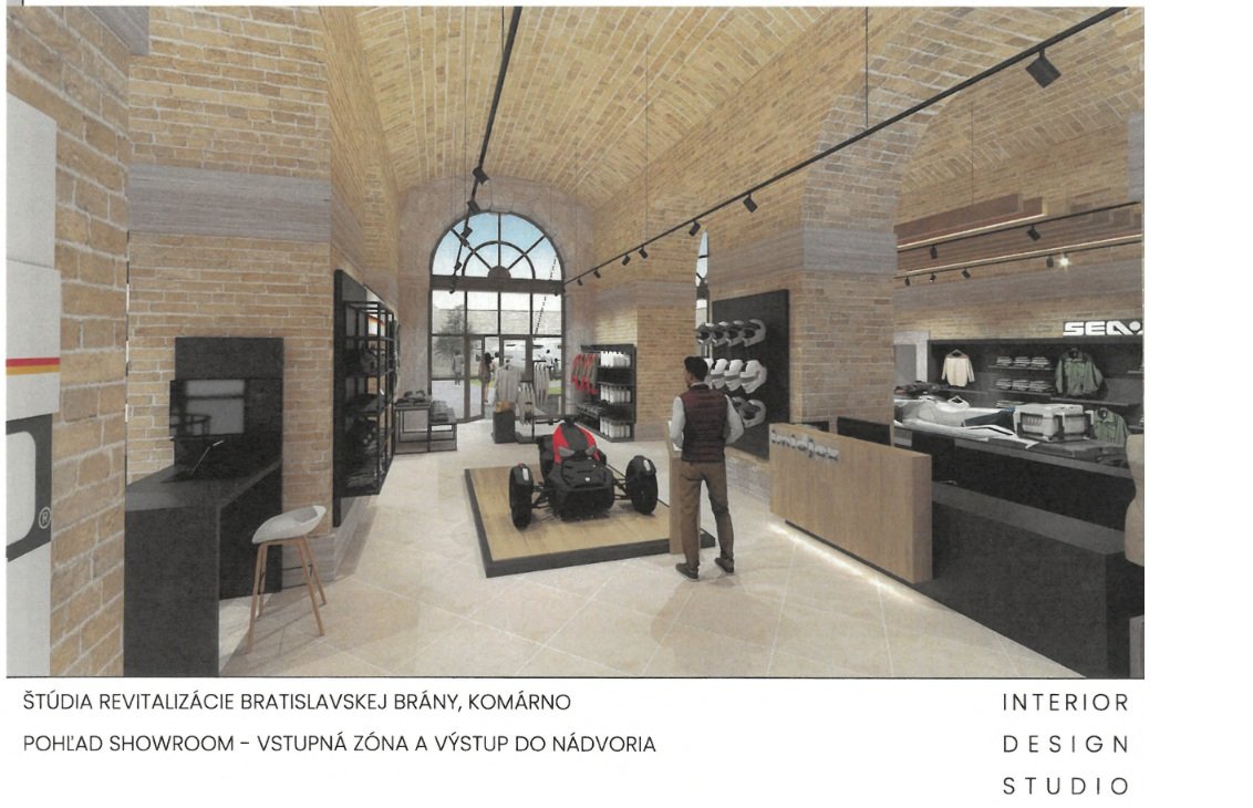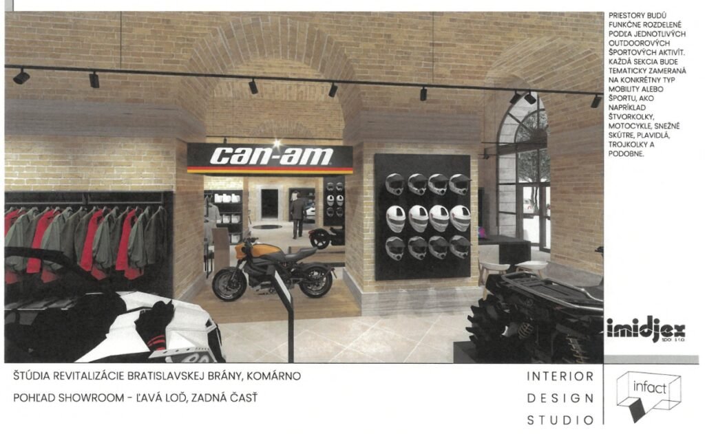 Z historického priestoru sa stane multifunkčné centrum s rešpektom k pôvodnej architektúre, čo podčiarkuje aj vizuálna štúdia interiérov s priznanými tehlovými klenbami. V pravej a ľavej lodi brány vzniknú moderné showroomy zamerané na outdoorové športové aktivity a mobilitu, kde sa budú prezentovať napríklad vodné a snežné skútre či štvorkolky známych značiek ako Can-Am a Sea-Doo.