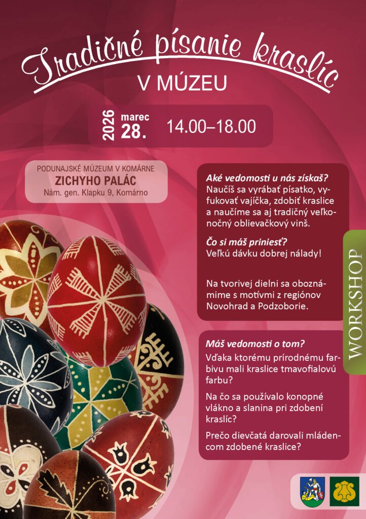 Podujatie s názvom „Tradičné písanie kraslíc v múzeu“ sa uskutoční v Zichyho paláci na Námestí gen. Klapku 9 v Komárne. Brány workshopu budú pre návštevníkov otvorené v čase od 14.00 do 18.00 hod.