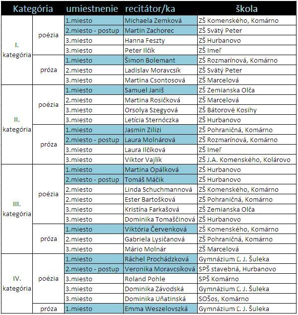 Vyhodnotili výsledky okresného kola 60. ročníka celoštátnej postupovej súťaže v umeleckom prednese poézie a prózy HVIEZDOSLAVOV KUBÍN 2014, ktoré sa konalo dňa 27.03.2014 v priestoroch Centra voľného času a ZŠ Pohraničnej v Komárne. Porota udelila spolu 30 ocenení, z ktorých na krajské kolo postupuje 12 recitátorov. Prezrite si tabuľku ocenených: