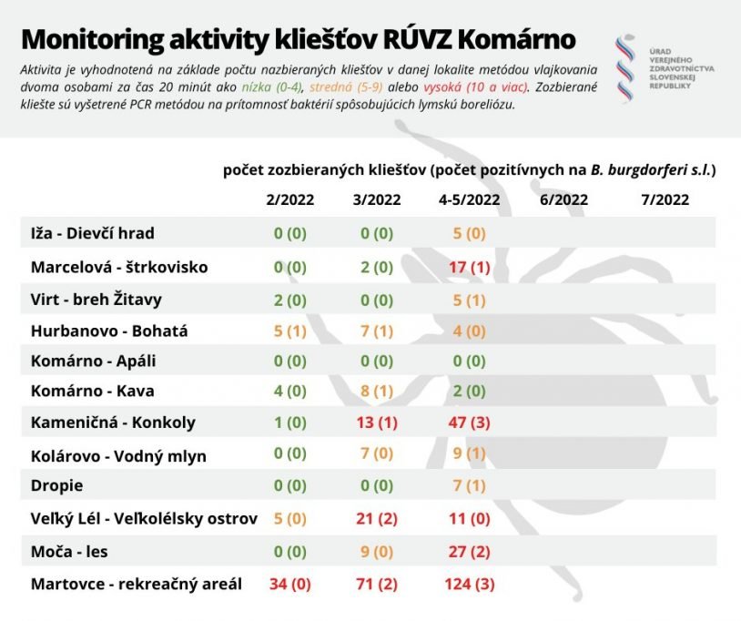 „Na prelome mesiacov apríl a máj, kedy sme vykonali ostatný monitoring, sme zaznamenali strednú alebo vysokú aktivitu kliešťov v desiatich z jedenástich sledovaných lokalít, na jednej lokalite bola aktivita kliešťov extrémne vysoká,“ zhodnotil RNDr. Martin Sojka, PhD. z RÚVZ v Komárne.