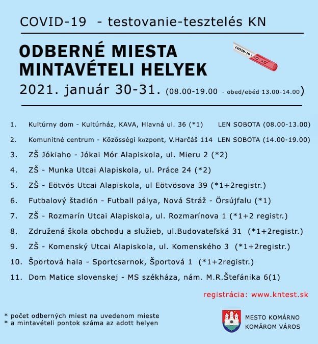 Druhé kolo skríningového testovania sa v Komárne a okolí bude konať počas víkendu 30. – 31. januára. Poznáme miesta, kde sa môžete registrovať.