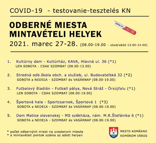 Podľa oznámenia vlády okres Komárno zostáva naďalej v bordovej fáze, čo znamená že občania budú potrebovať doklad o vykonaní testu nie starší ako 7 dni, preto samospráva aj tento víkend opäť zabezpečí testovanie, aby obyvatelia nemali s jeho zabezpečením problém.
