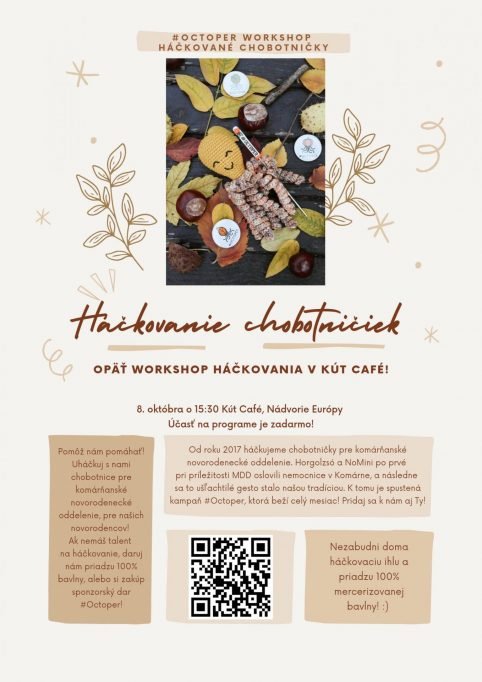 Október nám klope na dvere a to môže v Komárne znamenať len jedno. Aj tento rok sa bude konať obľúbený bezplatný OCTOPER workshop! Cieľom tejto obľúbenej akcie je háčkovanie chobotničiek, ktoré následne poputujú na novorodenecké oddelenie Nemocnice Agel v Komárne. Na výrobu chobotničiek sa tentoraz môžete tešiť v sobotu 8. októbra o 15:30.
