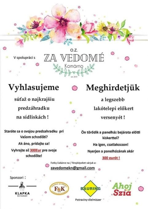 Občianske združenie Za vedomé Komárno vyhlásilo súťaž na svojej facebookovej stránke. Fotky o predzáhradkách je možné zasielať do 31. augusta na email zavedomekn@gmail.com. Pri zasielaní je potrebné uviesť fotky predzáhradky, názov ulice a číslo domu a meno súťažiaceho. Následne bude počas celého septembra prebiehať lajkovacia súťaž na facebooku združenia. Výhercov bude vyberať odborná porota z 10 fotiek, ktoré získajú najviac lajkov. Medzi výhercami sa rozdelia nasledovné ceny: 1.cena 300€, 2.cena 200€ 3. cena 100€ + špeciálne ocenenie pre balkón.