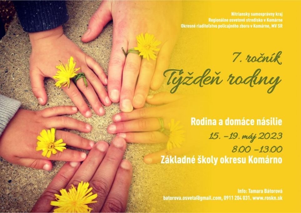 „Svetový deň rodiny si pripomíname 15. mája a pri tejto príležitosti „ROSka“ pripravuje edukačný týždeň na základných školách nášho okresu. S lektorkami Adrianou Grupáčovou a Ľudmilou Kliskou sa budeme v rámci podujatia 7. ročníka Týždeň rodiny venovať rodine a domácemu násiliu,“ informuje Jana Mačicová z Regionálneho osvetového strediska v Komárne.