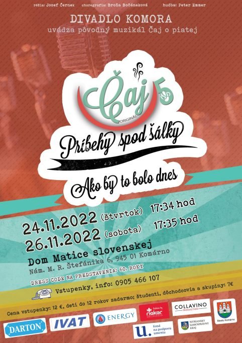 Čaj o piatej, muzikál z pera Jozefa Černeka, existuje už nejaký ten čas. Dielo predviedol Dramaťák, dramatický krúžok Gymnázia Ľ. J. Šuleka, ešte v roku 2017. V súčasnosti sa z krúžku stalo prvé slovenské profesionálne divadlo v Komárne – Divadlo Komora, ktoré toto predstavenie obnovilo a odohralo úspešnú premiéru 22. októbra 2022. Vzniklo len teraz, nedávno. No vydrží?