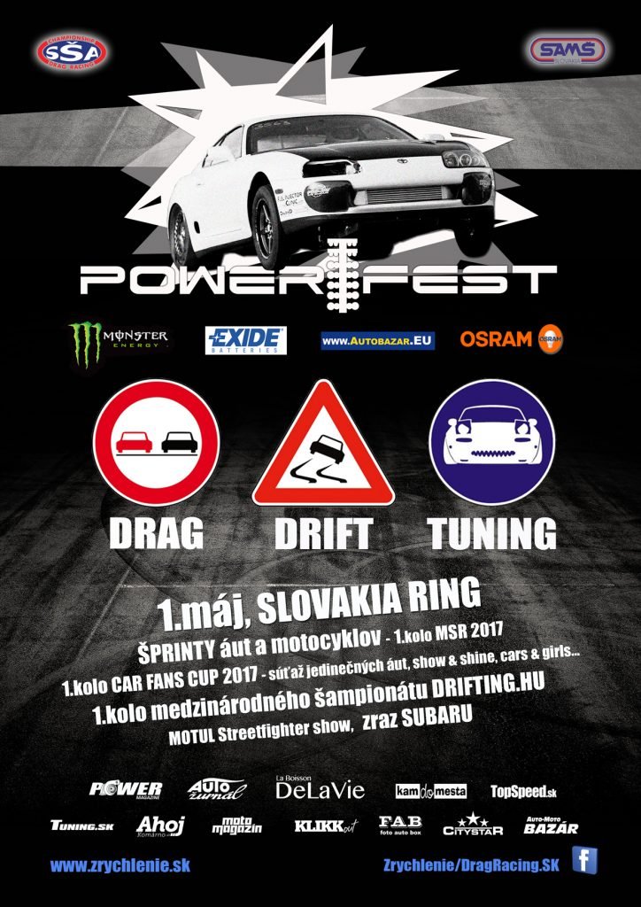 Po dlhej zimnej prestávke sa fanúšikovia disciplíny drag racing prvý krát stretnú v ročníku 2017 na Slovakia Ringu. Tradičný „Drag, Drift & Tuning majáles“ ponúkne 1.mája prvú konfrontáciu techniky a jazdcov na cieľovej rovinke okruhu, čím sa začne boj o cenné body v rámci šampionátu, vypísaného promotérom – Slovenskou šprintérskou asociáciou. Power fest sa bude niesť už po štvrtý krát v poradí v duchu spojeného eventu, kde si každý milovník rýchlych a jedinečných áut a motocyklov nájde niečo pre seba. Šprinty budú doplnené o medzinárodné preteky v driftingu, statickú súťaž Car Fans Cup aj zraz Subaru, takže núdza o adrenalínové závody a vyleštené automobilové skvosty určite nebude.