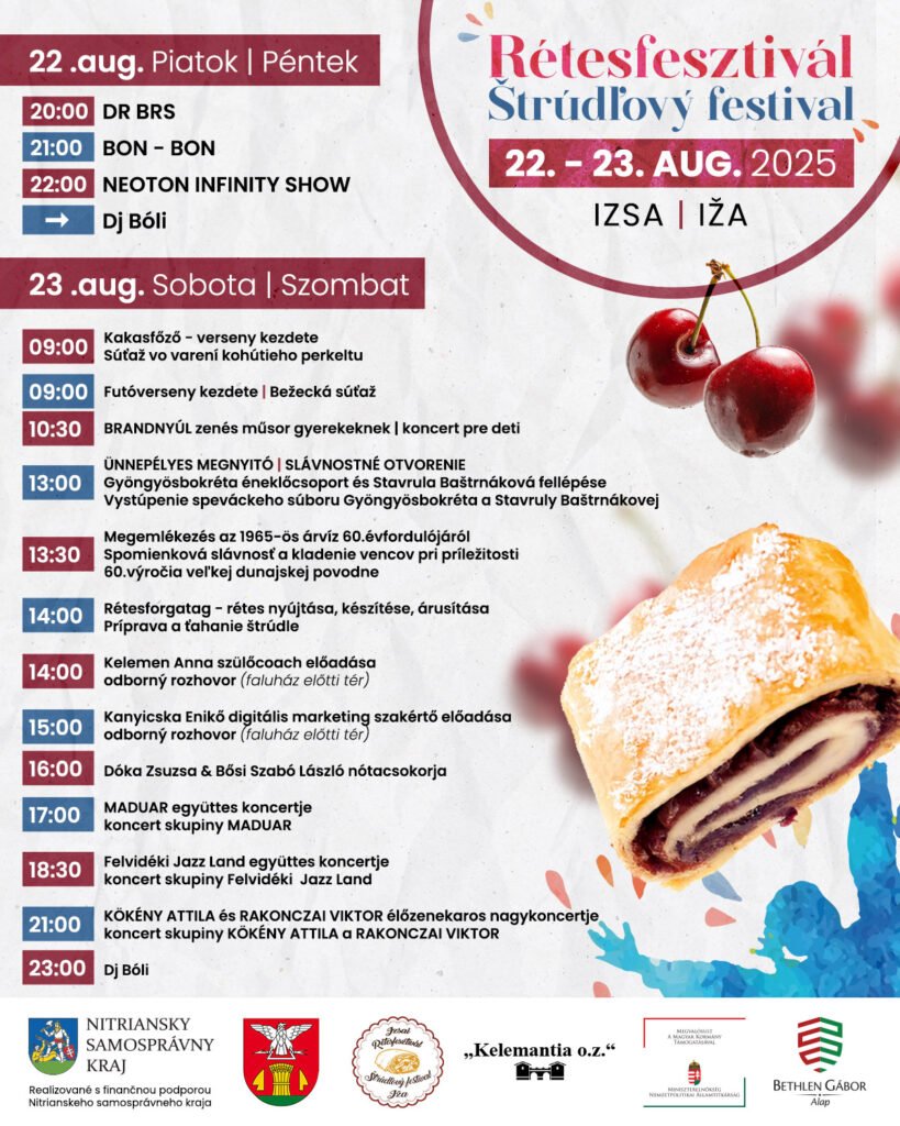 Obec Iža sa aj tento rok stane centrom chutí, hudby a dobrej zábavy. V dňoch 22. a 23. augusta 2025 sa tu uskutoční tradičný Štrúdľový festival – Rétesfesztivál, ktorý prinesie dva dni plné spoločenských zážitkov, hudobných vystúpení a rodinnej atmosféry.