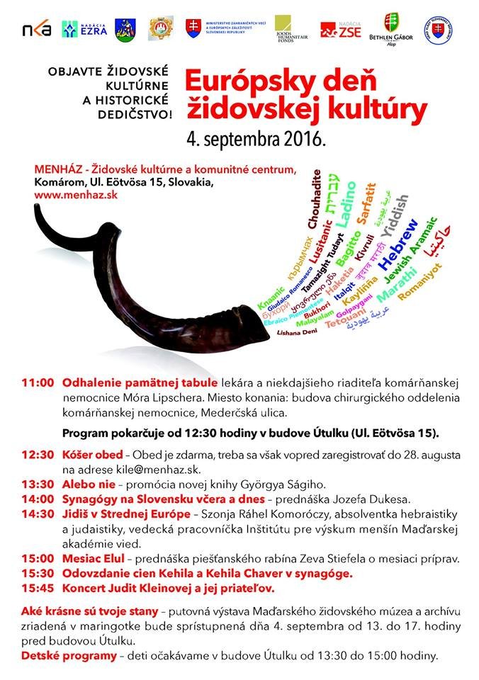 Pri príležitosti Európskeho dňa židovskej kultúry v nedeľu 4. septembra 2016 pripravila Židovská náboženská obec v Komárne pre vás celodenný program, na ktorý srdečne očakávame každého záujemcu.