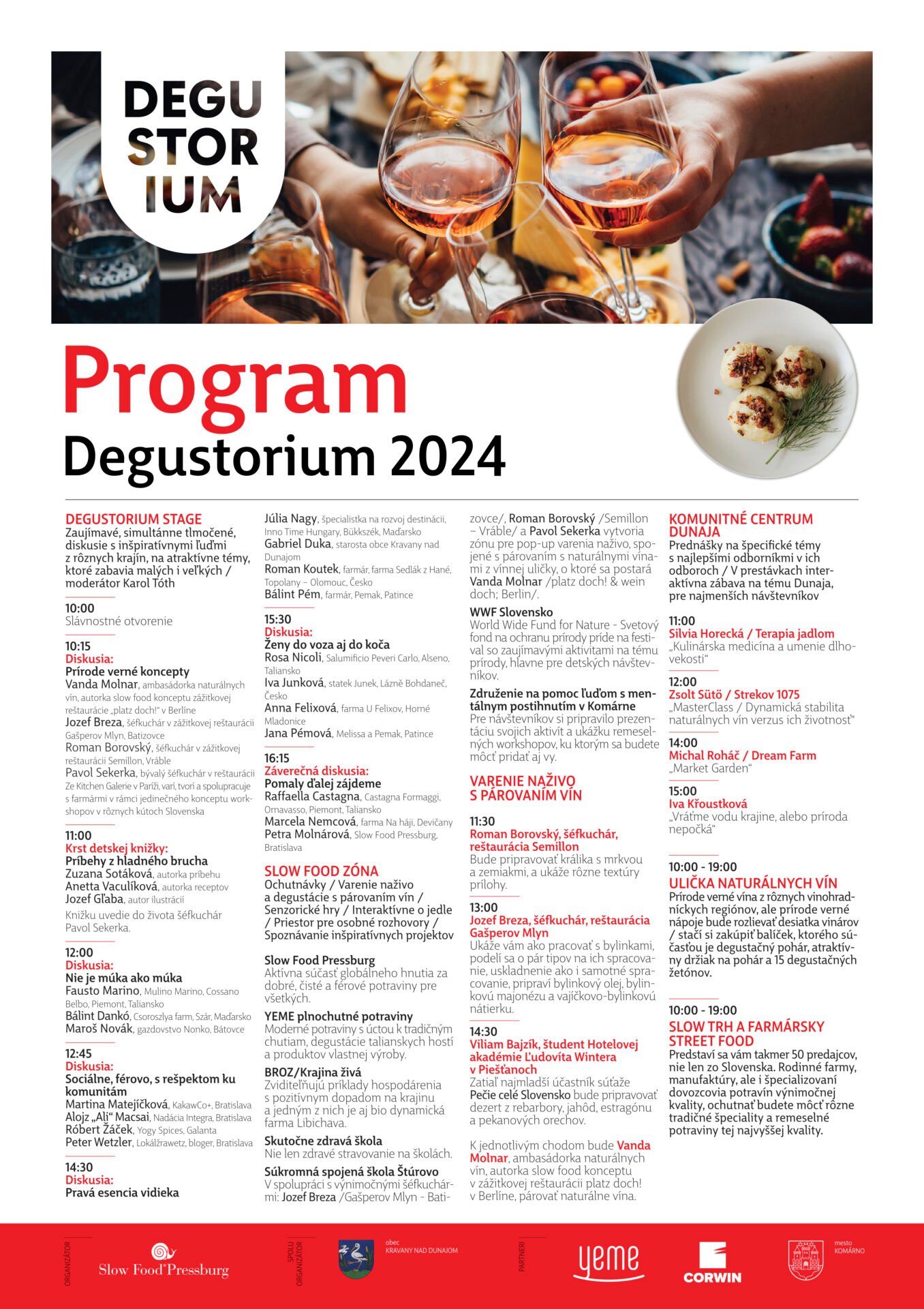 To, že sa dejiskom aktuálneho ročníka stane práve areál Dunajského korza v Kravanoch nad Dunajom nie je náhoda. Spolupráca medzi Slow Food© Pressburg, miestnou samosprávou, predovšetkým starostom Gabrielom Dukom, farmármi a manufaktúrami z blízkeho okolia sa začala už pred rokom. „Hneď na prvom stretnutí u pána starostu som vedel, že sme všetci, Slow Food© Pressburg, samospráva a my farmári na jednej vlne a bude to dobrá spolupráca“ zaspomínal si Pavol Bottka, ktorý je už 4. generáciou hospodáriacou, dnes už v ekologickom režime, na rodinnej farme v Kravanoch nad Dunajom. A nemýlil sa. V sobotu 25. mája 2024 bude Dunajské korzo, nádherný areál v susedstve majestátneho Dunaja, hostiť jedinečné podujatie svojho druhu, festival remeselných potravín s príznačným názvom DEGUSTORIUM. Obec Kravany nad Dunajom sa predstaví v úlohe spoluorganizátora a lokálny Náš TRH Karva oslávi svoj desiaty trh v poradí vstupom do medzinárodnej komunity Slow Food© Trhov Zeme.