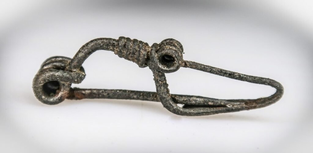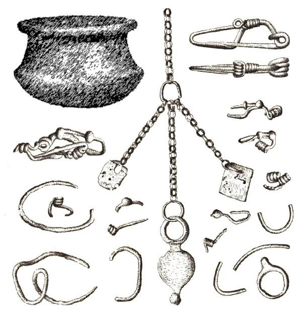 Archeológom sa nakoniec zo zvyškov v tomto hrobe podarilo identifikovať až 7 kusov kovových šatových spôn a niekoľko ďalších šperkov – rôzne náramky, prstene či retiazky. Železné a bronzové kovové spony boli predmetom dennej potreby s pomerne krátkou životnosťou. Používali sa na spínanie odevu v hornej časti tela, zvyčajne na pleciach.