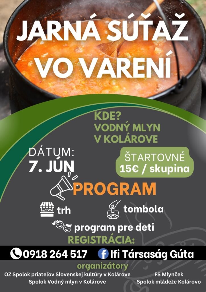 Jar vo vzduchu, vôňa gulášu v kotlíku a dobrá nálada na brehu Váha – to je Jarná súťaž vo varení v Kolárove, ktorá sa uskutoční 7. júna pri Vodnom mlyne.