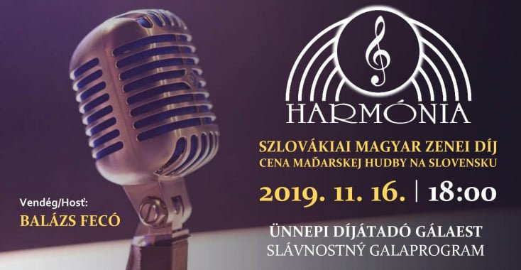 Slávnostný gala večer udelenia ceny Harmónia sa uskutoční 16. novembra 2019 od 18:00 hodiny v Mestskom kultúrnom stredisku v Komárne. Účinkovať budú: Ákos Benkó, Attila Zsapka, Hudobná skupina Pósfa, Concordia, Arizóna, Róbert Lakatos.