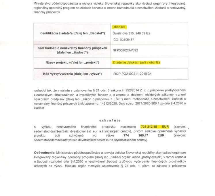 Ministerstvo pôdohospodárstva a rozvoja vidieka Slovenskej republiky schválilo nenávratný finančný príspevok vo výške 736 tisíc EUR na zriadenie detských jaslí v obci Iža.