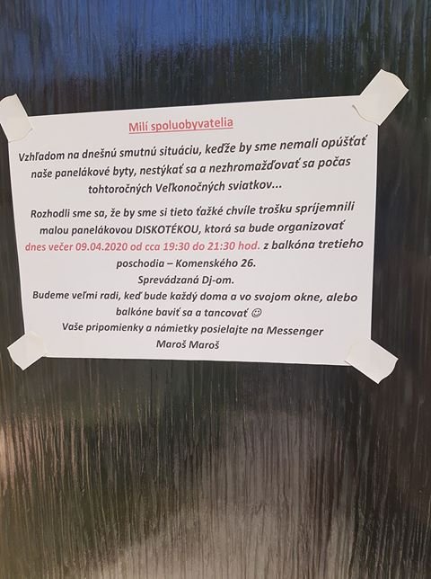 Aj napriek opatreniam, sa štvrtok 9. apríla niesol v znamení zábavy. Náladu z diskotéky sa rozhodol zaobstarať obyvateľ na Komenského ulici zo svojho balkóna.