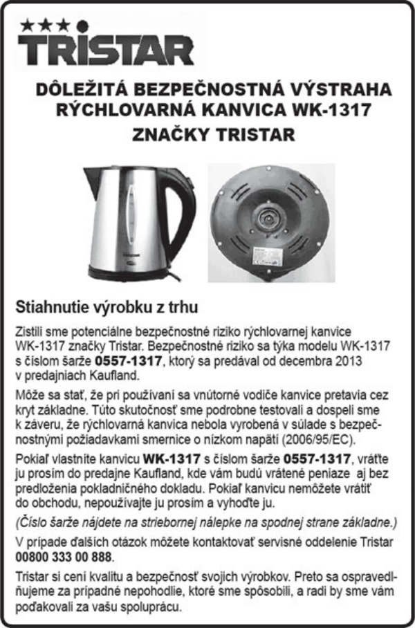 Úrad verejného zdravotníctva Slovenskej republiky varuje pred rýchlovarnou kanvicou Tristar. Ako informoval hlavný hygienik SR Ivan Rovný, úrad informovala o nevyhovujúcom výrobku spoločnosť Kaufland Slovenská republika.
