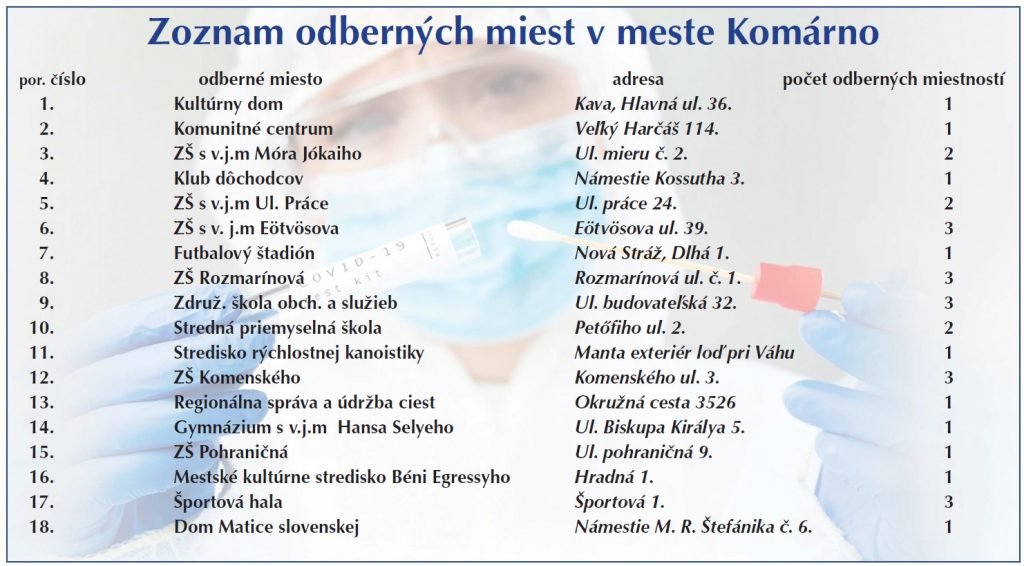 Keď niekto nepôjde náhodou na obvyklé miesto, alebo nemá trvalý pobyt v Komárne, aj tak mu urobia test na niektorom z 31 odberových miest na 18 adresách. Jedno odberové miesto bude aj v exteriéri, Manta, kajakáreň pri Váhu.