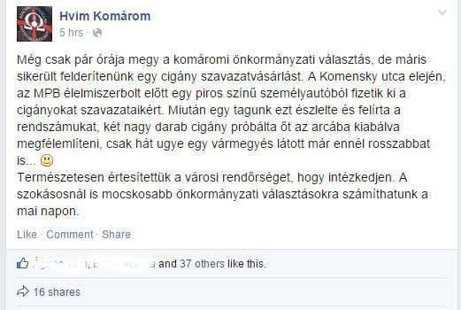 15:32 – Facebooková stránka Hvim Komárom upozorňuje na kupovanie hlasov na Komenského ulici. Podľa ich tvrdenia z jedného červeného auta platia za hlasy. Po tom, čo to zbadal jeden z členov Hvim, zapísal si evidenčné číslo vozidla a zavolal mestskú políciu.
