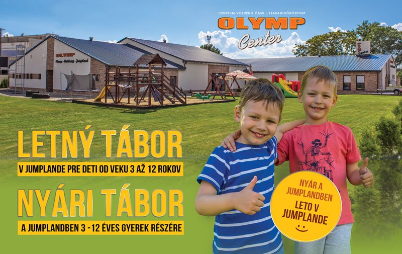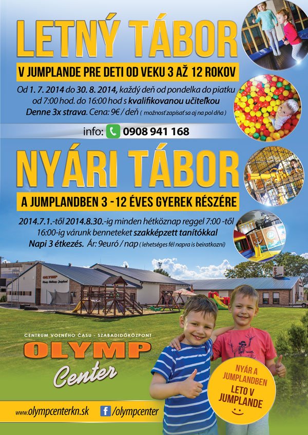 Olymp Center – Centrum voľného času organizuje letný tábor v Jumplande pre deti od veku 3 až 12 rokov. Od 1. júla 2014 do 30. augusta každý deň od pondelka do piatku v čase od 7.00 hod. do 16.00 hod. deti budú pod dohľadom dvoch kvalifikovaných pedagógov.