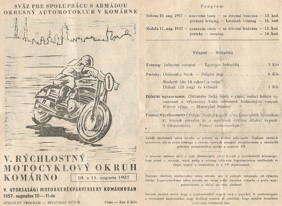 Keďže nielen jazdiť je zážitok, ale aj sledovať napínavé preteky, tak si Komárňania vytýčili v uliciach mesta regulárnu trať. A tak sa stalo, že sa v roku 1957 konal V. ročník rýchlostných motocyklových pretekov v meste – priamo pred očami niekoľko tisícového obecenstva.