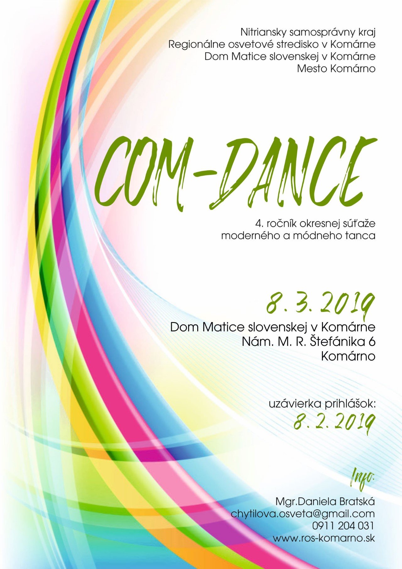 Regionálne osvetové stredisko v Komárne v spolupráci s Domom Matice slovenskej v Komárne vyhlasujú 4. ročník okresnej súťaže moderného a módneho tanca COM-DANCE, ktorá sa bude konať 8. marca 2019 v priestoroch Domu Matice slovenskej v Komárne, Nám. M. R. Štefánika 6, Komárno.