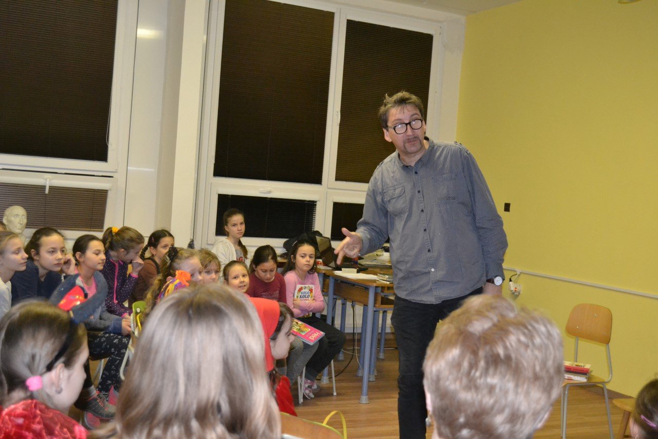 Hneď pri vchode vítali pani učiteľky žiakov, ktorí prichádzali do svojej, hoci pre túto noc tak zvláštne inej školy, so svojou kamarátkou knihou. A mali sme aj vzácnu návštevu – zavítal k nám pán Mrkvička (Tibor Hujdič) so svojím jedinečným dramatizovaným čítaním. Vďaka nemu sa tmavými chodbami rozliehal úprimný smiech, ktorý vyplynul z nefalšovaného záujmu o literárny príbeh a silu hovoreného slova. Po jeho čítaní mal každý pocit, že čítane patrí k základným ľudským potrebám, lebo jeho láska ku knihám bola priam nákazlivá.