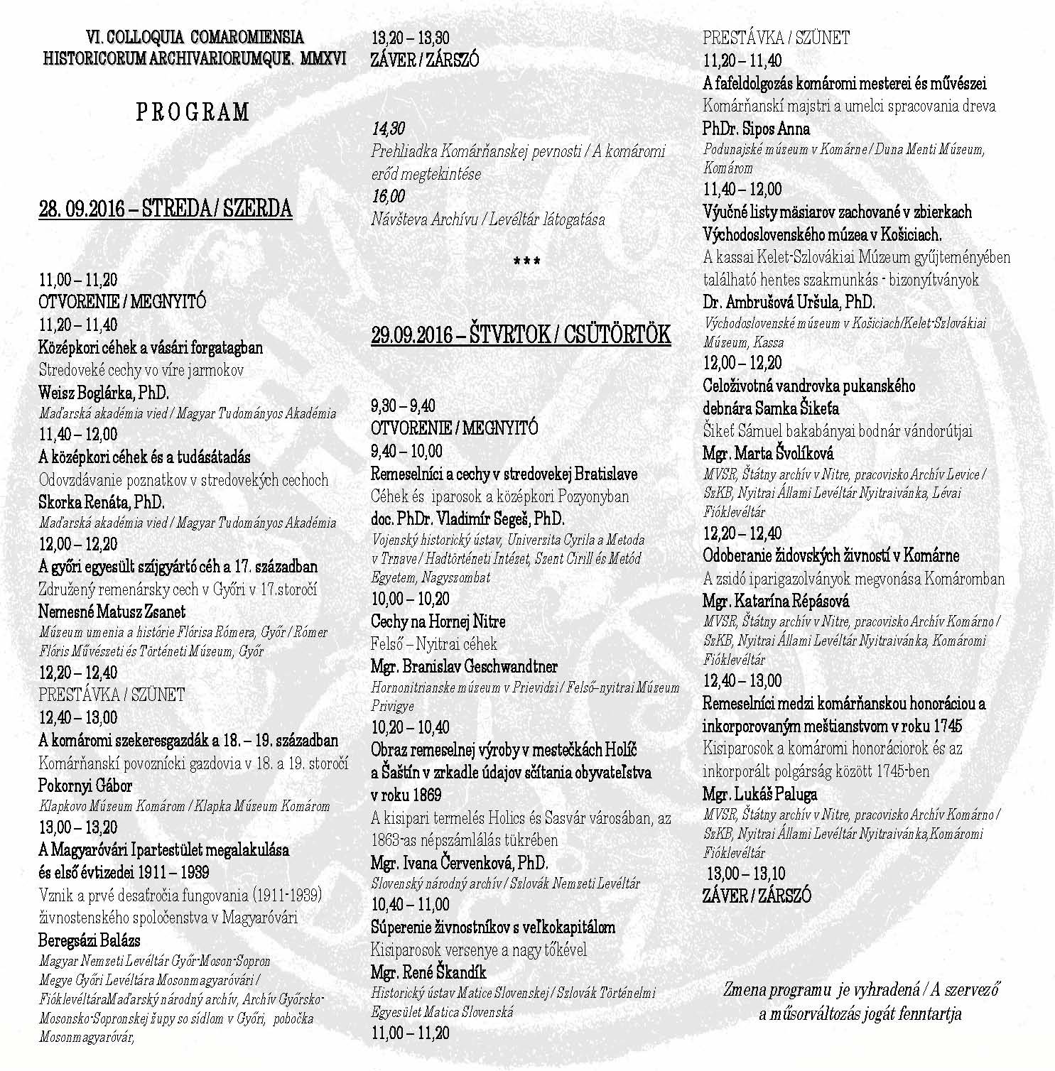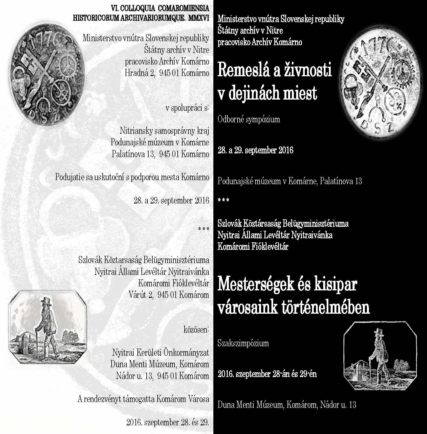 Ministerstvo vnútra SR, Štátny archív v Nitre, pracovisko Archív Komárno v spolupráci s Nitrianskym samosprávnym krajom, Podunajským múzeom v Komárne a s podporou mesta Komárno usporiada sympózium 28. a 29. septembra 2016 v priestoroch Podunajského múzea v Komárne na Palatínovej ulici.