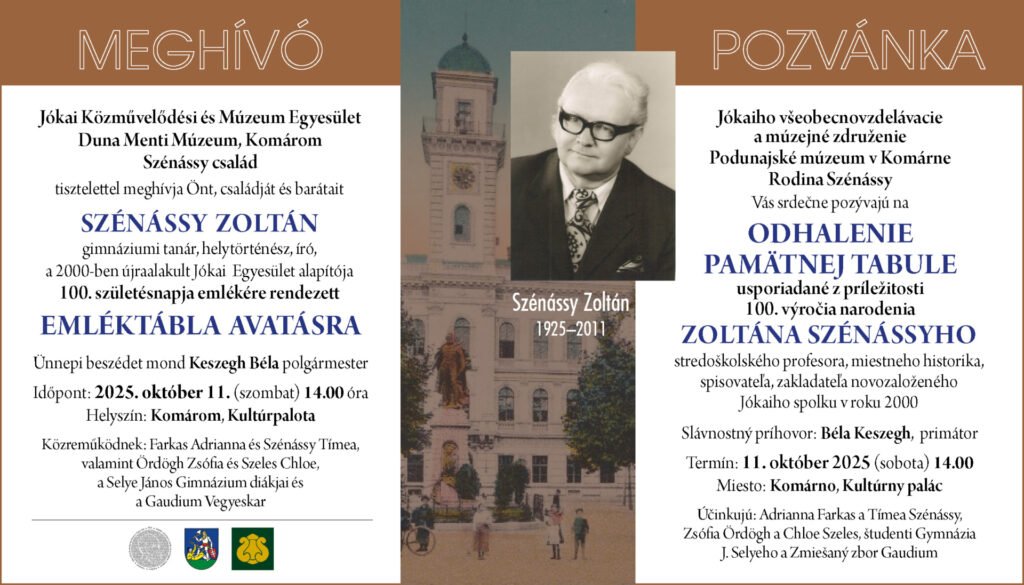 V sobotu 11. októbra 2025 o 14:00 hod. sa v Komárne, v Kultúrnom paláci, uskutoční slávnostné odhalenie pamätnej tabule Zoltána Szénássyho pri príležitosti 100. výročia jeho narodenia.