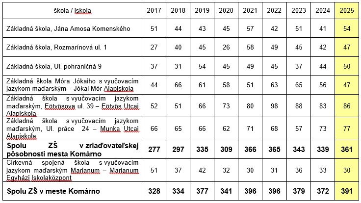 Počet prvákov v komárňanských základných školách opäť narastá. Kým v roku 2024 bolo zapísaných 372 detí, v školskom roku 2025 ich počet stúpol na 391. Tento nárast je najvyšší od roku 2021, čím sa potvrdzuje trend mierneho zotavenia po predchádzajúcich poklesoch.