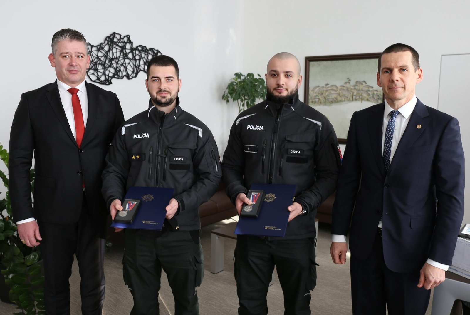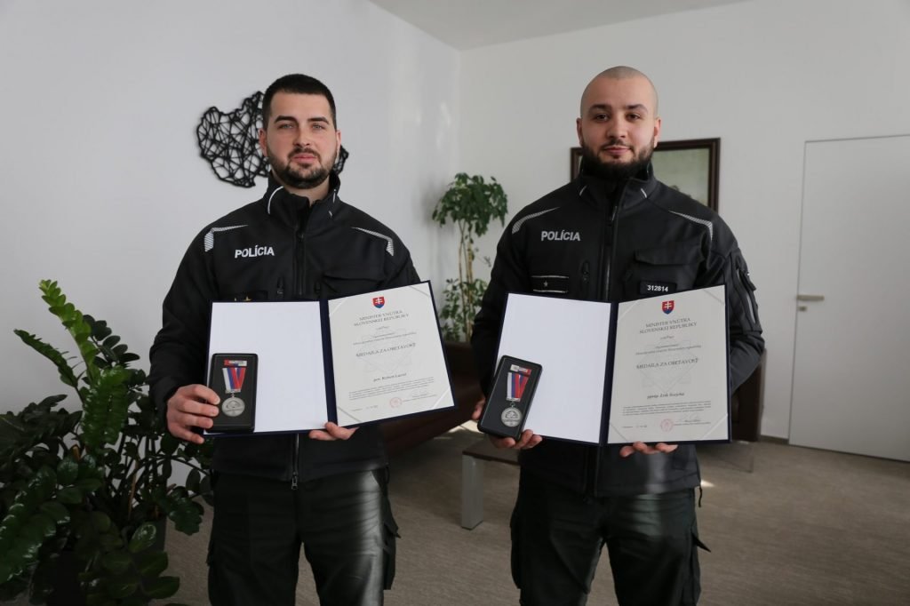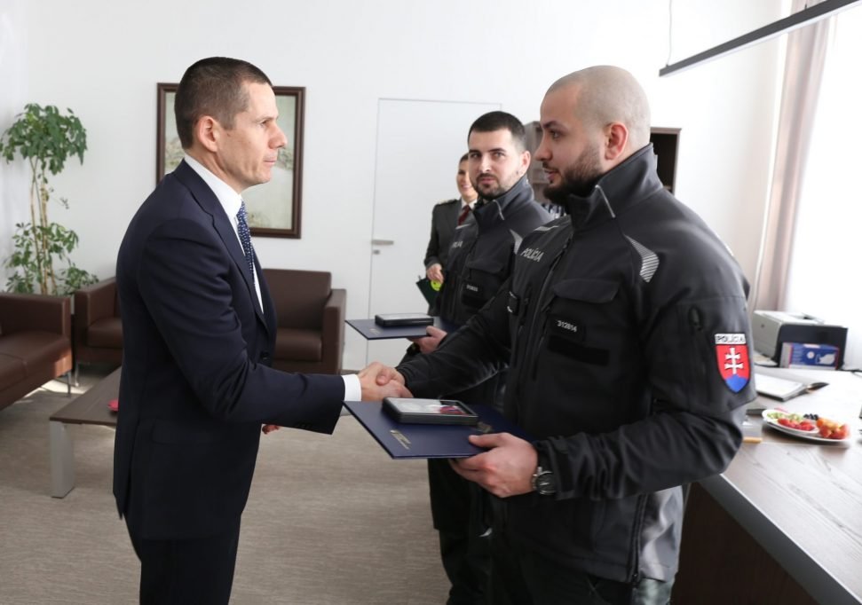 Policajný prezident Štefan Hamran, minister vnútra Roman SR Mikulec a viceprezident PZ SR Damián Imre v utorok 14. februára ocenili dvoch príslušníkov Policajného zboru, ktorí zachránili v januári tohto roku v obci Gbelce život muža pri požiari rodinného domu.