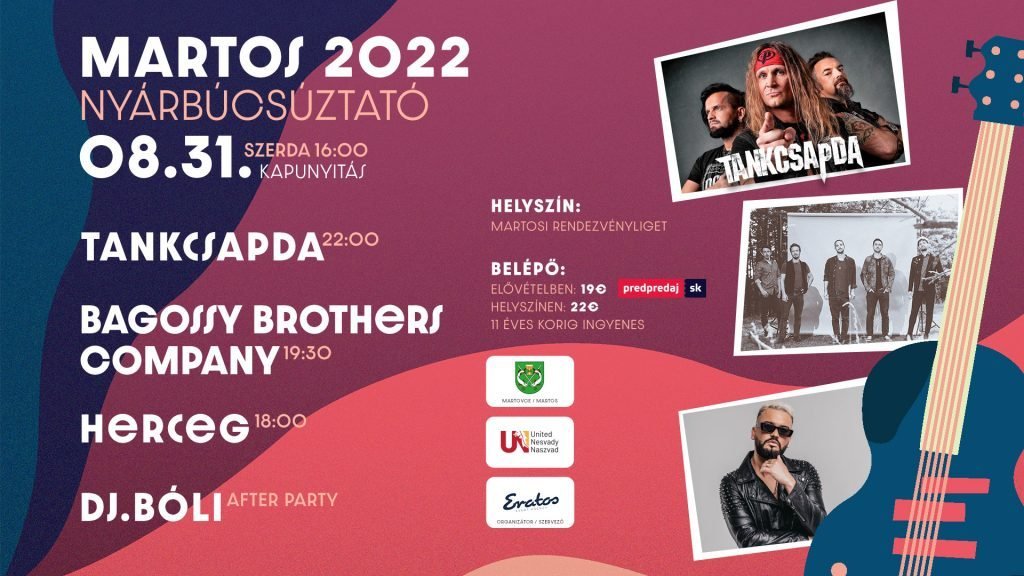 Obec Martovce nenechá nič na náhodu a plánuje obrovskú rozlúčku s letom! Už počas stredy 31. augusta sa milovníci hudby môžu tešiť na parádne koncerty známych maďarských interpretov a obľúbeného DJa, aby sme sa spoločne rozlúčili s letom za prítomnosti kvalitnej hudby a dobrej nálady.