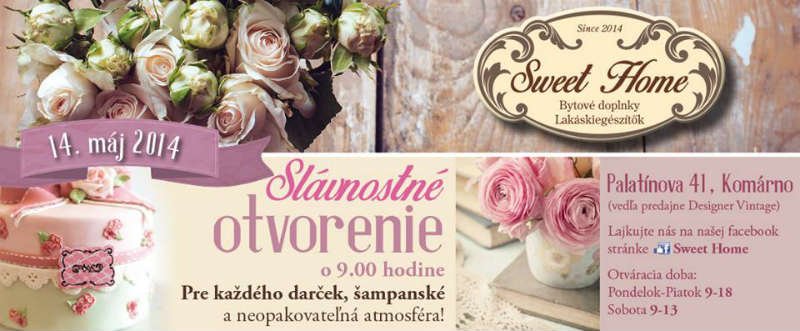Dňa 14. mája 2014, v stredu o 9:00 hodine sa uskutoční slávnostné otvorenie zázračnej predajne s názvom Sweet Home na Palatínovej ulici 41 (vedľa predajne Designer Vintage). Originálny obchod s dekoráciami a bytovými doplnkami v štýle shabby chic, toscana, provance s nádychom starého Francúzska a vidieckeho štýlu.