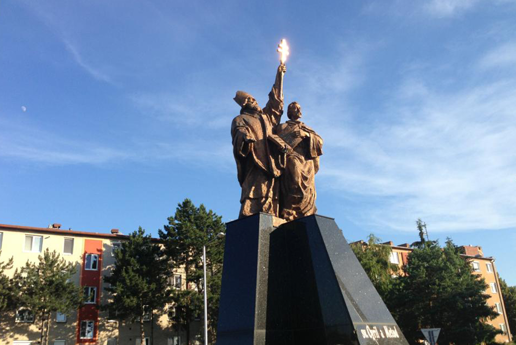 Socha solúnskych vierozvestov je z dielne akademického sochára Ladislava Beráka a vznikla v roku 1999. Samotné súsošie má výšku 3,9 metra a jeho vlastníkom je Matica slovenská. Bronzové súsošie sv. Cyrila a Metoda stojí v strede kruhového objazdu na Námestí Lajosa Kossutha. Socha zakladateľov slovanskej literatúry stojí na terajšom mieste od júla 2010, predtým sa nachádzala v budove miestneho Domu Matice slovenskej.