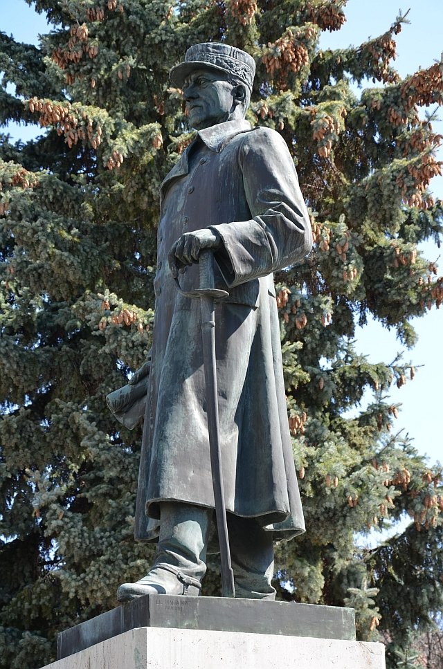 Vznik tejto sochy sa traduje k roku 1930. Vojaci 12. pešieho pluku, nesúc názov prvého československého ministra vojny, dali postaviť sochu z vlastných financií. Socha je dielom známeho českého sochára Otakara Španiela a v roku 1938 bola premiestnená do Banskej Bystrice, na vrch Urpín. Cestu späť našla v roku 1948, avšak dnešné dôstojné miesto pred Domom MS Štefánikovej podobizni našli až v roku 1990.