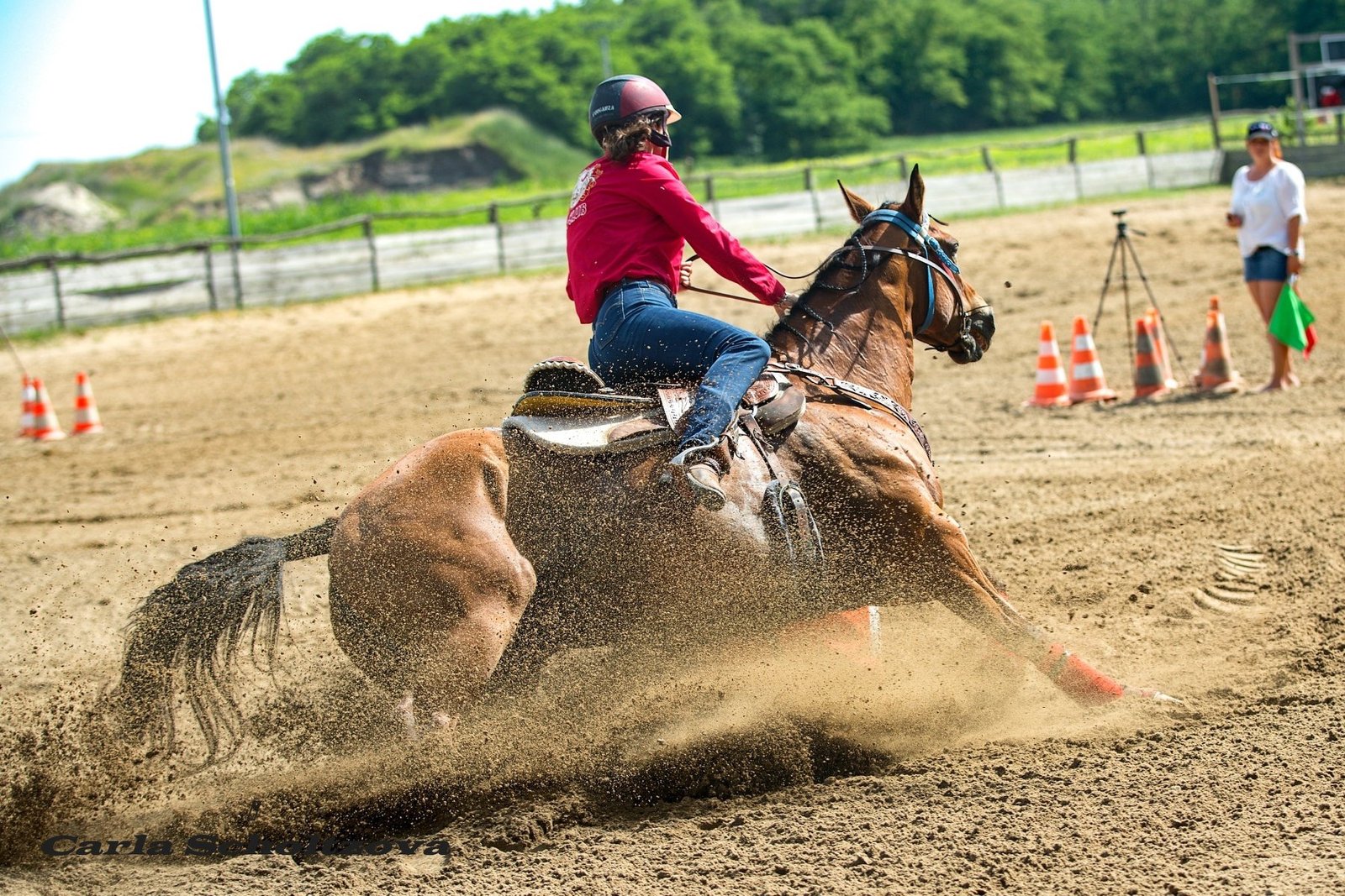 Na začiatok je dobré vedieť, že Carla súťaží v rýchlostných disciplínach, teda v barell race a pole bending v kategórii junior. „V pole bendingu je daných 6 tyčiek a keď jednu zhodím, tak dostanem 5 sekúnd. To znamená, že sa musím snažiť o to, aby som zhodila čo najmenej tyčiek, mala najlepší čas a tak vyhrala. U barell race to je rovnako. Sú rozmiestnené tri sudy a keď niektorý z nich zhodím, tak sa mi do času priráta 5 sekúnd,“ približuje jazdkyňa jednotlivé disciplíny. Najmä v týchto disciplínach dosahuje Carla úspechy. Za posledné roky získala tituly 1.vicemajserka Slovenska 2017 barell race junior, majsterka Slovenska 2018 barell race junior a majsterka Slovenska 2019 v barell race a pole bending v kategórii junior. Na tento rok mala Carla veľké plány, avšak situácia ohľadom koronavírusu si vyžiadala obeť aj v tejto oblasti. „Nakoľko je tento rok veľmi hektický, tak najprv tak bolo, že nebudú majstrovstvá Slovenska vo westernovom jazdení, ale nakoniec sa konali v októbri, ale bolo to viac-menej celé také neoficiálne. Tam som sa teda nedostala. Okrem toho som mala plány, že tento rok pôjdem na majstrovstvá Európy do Talianska, ale keďže je situácia taká aká je, tak ani na to nemám možnosť,“ hovorí so smútkom v hlase.