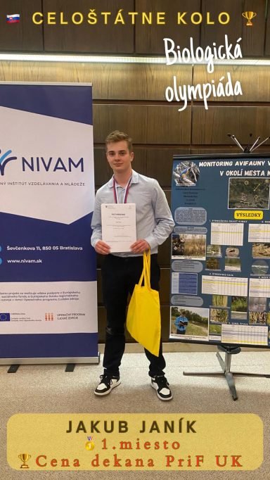V dňoch 19.- 21.4. sa konalo celoslovenské kolo biologickej olympiády kategórie C, kde Základnú školu na Rozmarínovej ulici reprezentoval Jakub Janík z 9.A. Študent vybojoval vo svojej kategórii prvé miesto, od dekana PriFUK dokonca získal špeciálne ocenenie.