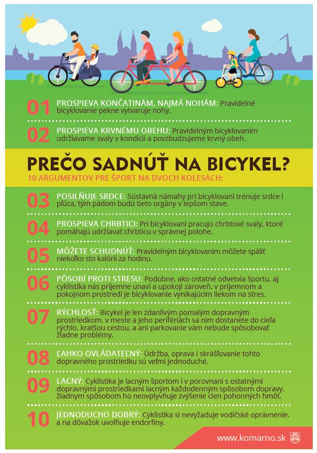 Aj v tomto roku sa Komárno prihlásilo do celoštátnej súťaže pod názvom „Do práce na bicykli“. Cieľom výzvy, ktorej trvanie ohraničuje jeden mesiac, je posadiť do sedadla bicykla čo najviac ľudí. Mesto by okrem cykloturistiky chcelo podporiť aj miestnych cyklistov.