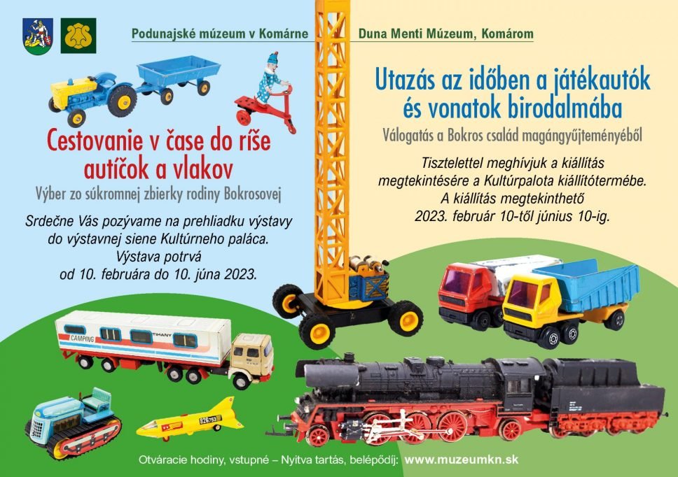 Výstava Cestovanie v čase do ríše autíčok a vlakov prezentuje výber zo súkromnej zbierky hračiek rodiny Bokrosovcov, pochádzajúcej z Ďulovho Dvora pri Hurbanove. Je dostupná od 10. februára do 10. júna 2023.