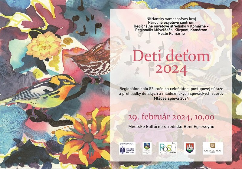Regionálne osvetové stredisko v Komárne uskutoční dňa 29. februára regionálne kolo 52. ročníka celoštátnej postupovej súťaže a prehliadky detských a mládežníckych speváckych zborov Mládež spieva 2024 pod názvom Deti deťom 2024 v priestoroch MsKS Béni Egressyho v Komárne.
