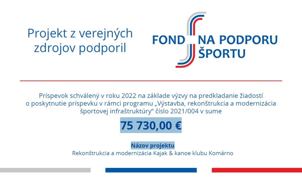 Dňa 14.6.2024 došlo k slávnostnému odovzdaniu projektu podporeného Fond na podporu športu vo výške 75 730,00 € a Mesto Komárno – Komárom Város vo výške 42 000 EUR.