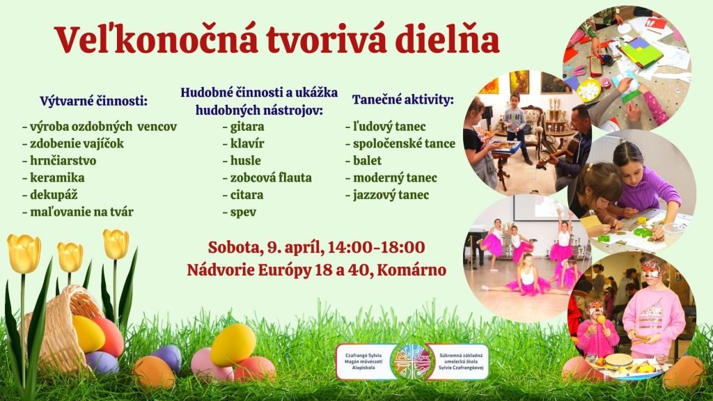 Zapojiť deti do kreatívnych aktivít nikdy nie je na škodu a teraz je na to jedinečná možnosť v Súkromnej základnej umeleckej škole Sylvie Czafrangóovej! Vďaka akcii s názvom Veľkonočná tvorivá dielňa sa návštevníci môžu tešiť na bohatú paletu výtvarných činností ako napríklad výrobu ozdobných vencov, zdobenie vajíčok, hrnčiarstvo, keramiku, dekupáž alebo maľovanie tváre.