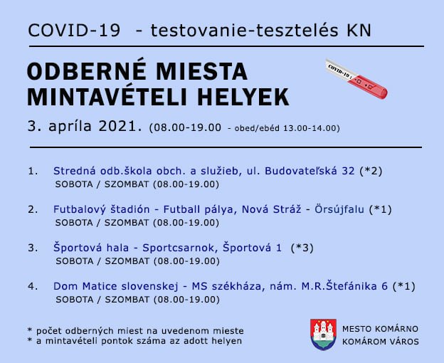 Avšak pre pendlerov a rodičov žiakov, ktorí navštevujú školské zariadenie, naďalej platí, že musia mať certifikát nie starší ako 7 dní. Samospráva pre týchto občanov zabezpečí testovanie v sobotu (v nedeľu teraz nie). V školách bude testovanie prebiehať obvyklým spôsobom, prostredníctvom registrácie na už známej stránke. Na ostatných (nižšie uvedených) miestach bude testovanie prebiehať bez možnosti registrácie. Po veľkonočných sviatkoch samospráva, v prípade potreby, opäť rozšíri možnosti testovania, aby si každý mohol zabezpečiť požadované potvrdenie.